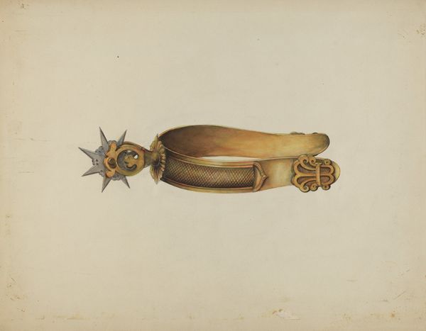Curator: Samuel W. Ford created this lovely piece around 1939. It's titled "Lock and Key," rendered with watercolor and pencil on paper. Editor: My first impression is how aged and weathered it looks. The details highlight the ironwork's wear, emphasizing its material reality as something functional yet almost obsolete. Curator: Absolutely. Consider the social context, too. During the late 1930s, issues of security and privacy took on greater urgency given both The Great Depression, but the impending Second World War. Domestic space becomes crucial and deeply gendered, speaking volumes about access and control during a volatile era. Editor: I'm interested in that tension between craft and utility. The lock and key become obsolete together. The process of aging transforms them and the paper through natural processes, from shiny, functional material, to rust and sepia. What do you think this elevation to fine art does to these objects? Curator: I'd argue it asks us to interrogate what’s valued, and by whom. To depict such mundane objects elevates them to something worthy of attention, maybe challenging hierarchical structures, inviting dialogue regarding labor, production, and accessibility. This shifts who gets seen and what narratives become amplified, doesn’t it? Editor: It does. By focusing on the individual components – the bracket, the tumblers, and the levers of the lock–Ford deconstructs an item into parts. Even its rusted texture hints towards age or previous use. These details root it to something beyond mere domesticity. Curator: I also read an element of vulnerability. "Lock and Key" touches upon the concept of forced entry into women’s spaces through visual means and its link to institutionalized sexism prevalent throughout Western history; even to this very day… The symbolic dimensions offer an important lesson. Editor: I agree that the imagery provokes a lot, and while the historical elements cannot be forgotten, the value put into creating this particular item with precision says a lot. I am interested how the artwork embodies transformation from mundane artifact into symbol. Curator: Indeed, by prompting us to explore the symbolism, cultural relevance, and history embedded within everyday objects like the lock and key, hopefully audiences today begin to see the rich textures of our past but consider the deep fractures still apparent in our current culture. Editor: The details on each lock or key are an example of labor as an artform. To value labor is to also value history, even obsolescence can be elevated through artmaking.