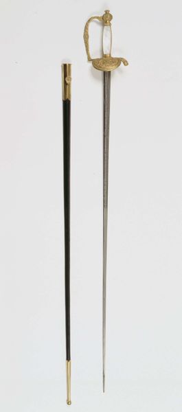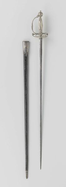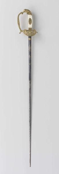Curator: Here we have a delightful piece, a small ceremonial sword, known as "Sierdegen voor een kind," crafted around 1750. It’s currently held in the Rijksmuseum. What are your first impressions? Editor: Striking! Its slenderness and delicate ornamentation evoke a sense of preciousness but also inherent tension. You've got the unmistakable craftsmanship dedicated to something intended for a child, or perhaps a young nobleman, if we are being honest here. Curator: Indeed, the Baroque style is evident in the hilt's elaborate curves. The use of metal gives it weight and permanence. But do consider, it is not meant to be a plaything. Editor: Absolutely, and I find myself thinking about the labor that went into such an object. What were the working conditions like for the metalworkers who shaped this? Was this produced using specialized, proprietary methods that were jealously guarded by a given manufacturer? We are talking about raw materials, supply chains, all for the accoutrements of wealth and power, handed to a child. Curator: A fascinating perspective. The semiotic function of the object itself bears contemplation. As a miniature version of an adult weapon, what symbolic associations does it carry about entering manhood, governance, lineage, nobility and, further, the expectations and burdens placed upon someone born to a position of authority? Editor: I can't help but look at how the sword represents social and economic disparity, too. The hours of skilled labor and precious metal versus the bare necessities of many families at the time. Even a child's toy speaks volumes about consumption and societal inequality in the mid-18th century. Curator: Precisely. We must consider this cultural context for full appreciation. The child may wield the physical object, but societal structures give it real symbolic weight. Editor: The power structures implied by this miniature symbol of control are just so obvious; examining this is valuable even today, when we look at the implications of inequality. Curator: Yes, contemplating this object encourages us to confront power dynamics—how objects gain significance beyond inherent materiality. Editor: The sword gives such rich information. Who wielded power then and at what cost? Always the questions one must bring.