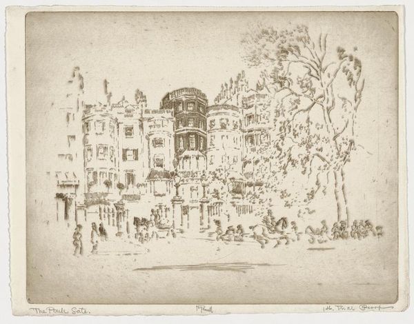 Editor: This is "Viswinkel in Chelsea," or "Fish Shop in Chelsea," an etching by James Abbott McNeill Whistler, dating from 1884 to 1886. I find it quite evocative, this scene. It’s like a snapshot of daily life, but it also feels a bit… unfinished, maybe? How do you interpret this work? Curator: It’s precisely that "unfinished" quality that speaks volumes. Whistler wasn’t simply documenting a fish shop. Consider the social context: Late 19th-century London was grappling with immense change—industrialization, urbanization, class divisions. Whistler's impressionistic approach, focusing on atmosphere and fleeting moments, resists a purely realist representation of working-class life. He is less interested in accurate depiction, and more in documenting the emotional impact of this rapidly changing city. Editor: So it’s about more than just what we see in the picture? Curator: Absolutely. It’s crucial to think about who is depicted and who isn’t. Are the workers visible? Are they individualised? Or are they generalized members of the anonymous public? Are women and children present, and how are they posed and situated relative to other people? Who has access to this “scene?” And from what perspective? By obscuring details and highlighting the overall tone, Whistler prompts us to contemplate the hidden stories within these scenes, forcing us to think about the politics inherent in his style, and asking how impressions function in a period of unprecedented urbanization. Editor: That makes a lot of sense. The vagueness, then, encourages the viewer to project their own understanding onto the scene, filling in the gaps of that urbanization? Curator: Exactly. It’s not about what’s literally there, but what’s suggested. What it means to *look* at the world in a very particular, almost detached way. In short, he’s critiquing social observation itself. The "fish shop" then, becomes a symbol of a society grappling with its own rapid transformation. Editor: Wow, I’ll definitely see this—and other art—in a new way now. I never really thought about impressions that way! Curator: The best art should always make us reconsider the way we engage with the world.