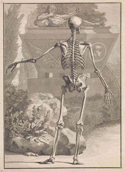 Curator: This detailed engraving is entitled "Musculorum Tabula VIII" by Jan Wandelaar, created around 1742. Editor: It strikes me immediately as quite stark, a curious juxtaposition of delicacy and the brutal reality of anatomy. The skeletal figure, rendered with such meticulous precision, is oddly vulnerable against the looming presence of what I believe is a rhinoceros. Curator: Indeed, it’s fascinating to consider the artistry inherent in scientific illustration. Wandelaar, an accomplished engraver, displays extraordinary skill here. Observe the finely etched lines; they articulate every ridge and curve of bone with remarkable fidelity. The medium, engraving, becomes crucial, facilitating a replication of the image for broader dissemination. Editor: Yes, but isn't the image as much about labor as artistic skill? Someone meticulously crafted the copperplate. Each line a physical act, echoing the hard labor of the tanner transforming raw hide into the material for these engraved sheets, paper and inks created in mills and work shops, a truly handmade image! Curator: But do we not see a strategic construction? The contrapposto of the skeleton introduces a subtle dynamism, leading the eye upward along the spinal column to the implied vanishing point. There's also the positioning of the rhinoceros – partially obscured, perhaps symbolizing the limits of contemporary knowledge regarding exotic fauna. Editor: I'd agree about limits, there seems to be some imaginative liberties there in regards to the representation of the rhino - clearly informed by textual descriptions rather than the real animal, a collision of natural philosophy with artisanal knowledge, the skills and interpretations of those creating an "objective" image! Curator: It embodies the intersection of art and science prevalent during the Baroque era. We are witnesses to the period’s interest in exploring human anatomy through both an aesthetic and an empirical lens. Editor: A confluence perhaps – where meticulous production practices meet the aspirations of scientific documentation? In a way, the making mirrors the act of dissection itself: a layer-by-layer reveal. Curator: An intriguing image, laden with anatomical and artistic considerations. Editor: Precisely. This is no mere picture; it is evidence of intersecting knowledge.