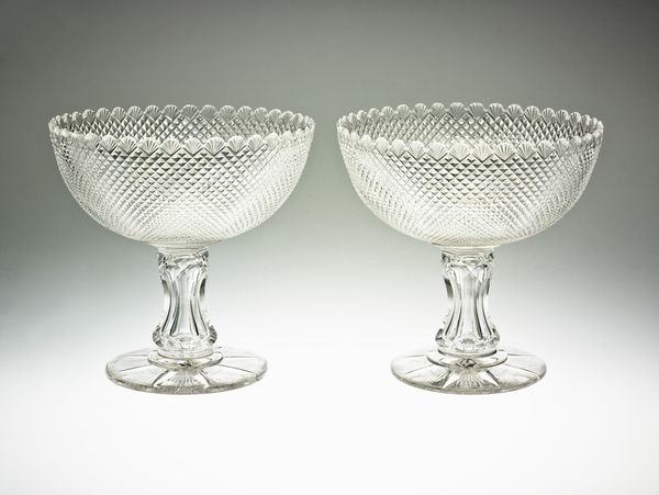 These cordial glasses were made by the New England Glass Company between 1818 and 1888. Note the intricate diamond-cut pattern at the base of the bowl, a motif that has traversed centuries. We see this pattern echoing in ancient Roman mosaics and medieval stained glass. These diamonds, with their multifaceted surfaces, play with light, a symbol of clarity and illumination. In the Middle Ages, such geometric precision was often associated with divine order. The images engraved at the top of the glasses also show the theme of idealized landscapes, which is as old as art itself. Consider how these elements recur, transformed yet recognizable, across diverse epochs. The diamond evolves from a representation of sacred geometry to a symbol of luxury, demonstrating the fascinating persistence of these forms and their adaptable meanings through time.