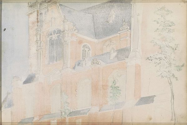 Editor: So, this is Johan Adolph Rust's "De Oude Kerk te Amsterdam," a watercolor drawing from 1843. It's kind of a moody sketch, all muted colors. What do you see in this piece? Curator: I see a document of a specific time and place, but more importantly, I see a record of the social and political landscape viewed through the lens of architectural space. Consider, what did a church represent in 1843? Whose voices were amplified within its walls, and whose were silenced? Editor: So, you’re saying it’s more than just a pretty picture of a building? Curator: Precisely! It’s crucial to unpack how these spaces contribute to larger narratives of power and identity. How does the composition—the partial view, the angle—hint at the artist’s position relative to the church, and potentially to the institution it represents? Editor: I see what you mean. The way it’s cropped makes it feel…almost imposing, but also incomplete, like there’s more to the story. Curator: Exactly. And who gets to tell that story? Was Rust merely capturing the church, or was he implicitly commenting on its role within Amsterdam's social fabric? How do the materials -- watercolor, paper -- factor into our understanding of the piece as a kind of document? Editor: It's like the sketch itself becomes evidence. I hadn't really thought about it that way before. Thanks! Curator: Indeed. Examining art this way opens up important conversations about who gets represented, and how historical spaces can be interrogated through a contemporary lens. Editor: That's a really powerful way of thinking about art. It makes me see these older pieces as active participants in current discussions, not just relics.