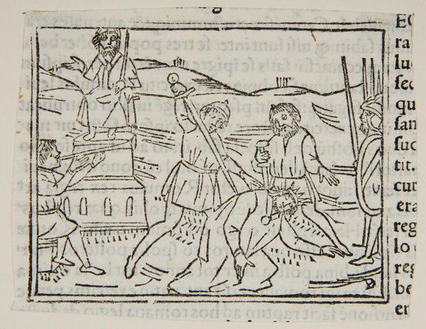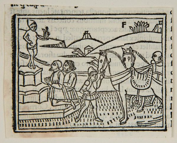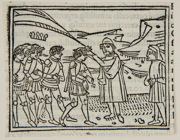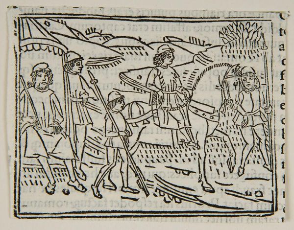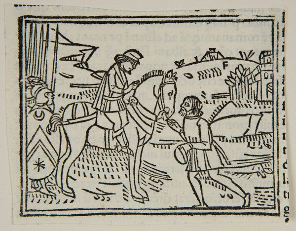 Editor: This is an anonymous woodcut print, "Book IX.24. Roman army met by a deserter from Sora who informs them how to take the city." The stark black and white lines give it a sense of immediacy. What symbols do you see at play here? Curator: The deserter, offering information, isn't just a plot device. He's a visual symbol of internal conflict, mirroring the city's vulnerability. His posture, the offering in his hands…it’s loaded with meaning. What emotions do these symbols evoke for you? Editor: I see desperation, maybe? And a betrayal of trust. Curator: Exactly. Notice how the Roman soldier remains stoic, almost detached? This contrast highlights the tension between order and chaos, loyalty and treachery, themes deeply embedded in Roman history. The visual language speaks volumes. Editor: So the image isn't just about the event, but the underlying ideas? Curator: Precisely. It’s a cultural memory, visually encoded. I never thought about it that way. Thanks!