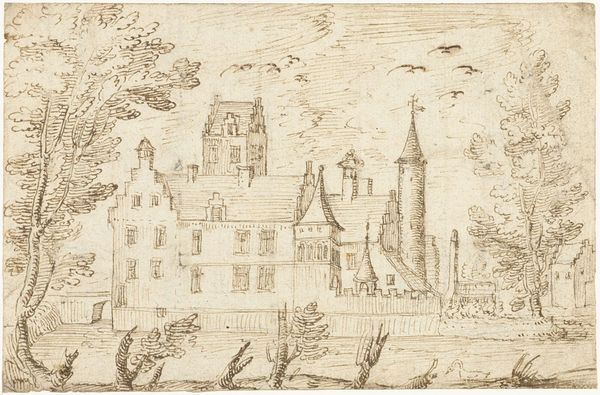 Curator: This is "View of Kleef," a pen and ink drawing by Jan Lievens, created in 1664. Editor: There's a sense of quiet industry to it, almost like a staged theater set with each building presented neatly and pragmatically. A brown monochrome sketch... but more somber than quaint. Curator: Somber is a good word. The drawing is made with broad strokes that nevertheless allow one to appreciate Lievens’ understanding of line and mass. The hatching in the shadowed areas and the almost frenetic, yet controlled, strokes that make up the trees are just remarkable. Note how the spire in the background pierces the scene. Editor: Indeed, and it pierces its viewers. Look at how the boats are nestled gently, lower down, in the scene. Then let your gaze ascend toward the imposing architectural mass, which certainly feels like a conscious placement to reflect the might of centralized power relative to the everyday Dutch life and landscape below. Curator: Yes, though its muted rendering, like the wisps of smoke, allows it to sit harmoniously within the scene. Rather than overpowering it, I'd argue. See the clever use of empty space, for instance. Editor: Perhaps. The empty space provides that separation, certainly. However, its imposing height and stylistic starkness still speak to an architecture that’s removed from the immediate reality of the town. It speaks of an establishment that looms, detached from the common person even within such domesticity. The buildings cascade to the waterline. There’s a dialogue here on socioeconomic levels. Curator: I appreciate that reading. To my eye, the appeal resides in the tension between the deliberate composition, with its contrasting textures and light, versus the looseness afforded by the drawing medium. Editor: Agreed. And within this, a social dialogue of controlled landscape versus implied power, that makes the Dutch Golden Age speak across the centuries to current times. Curator: An engaging set of social contrasts that perhaps overshadow Lievens skill. Thank you. Editor: Thank you. Another opportunity to consider power and aesthetic decisions.