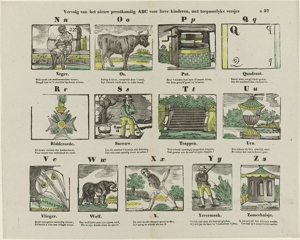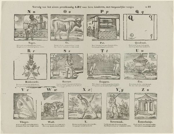 This alphabet print for children was likely made in the 1800s by an artist known only as Monogrammist JZ. Its neat arrangement of images and text provides an insight into how education harnessed visual culture. The layout is structured into a grid. Each letter is paired with an image, reflecting a concern with order and categorization. Notice how the artist’s engraving technique creates varied textures and tonal contrasts. This provides visual interest, inviting closer inspection. However, the images themselves introduce ambiguity. While seemingly straightforward, the selection of subjects – from a monkey ('Aap') to a magician ('Goochelaar') – presents a mix of the familiar and the exotic. This juxtaposition complicates any simple reading of the images as merely illustrative aids. Consider how the print engages with structuralist ideas about language and representation. The alphabet serves as a foundational structure, yet the content undermines fixed meanings. This tension highlights how visual culture participates in shaping understanding, even while questioning its stability.