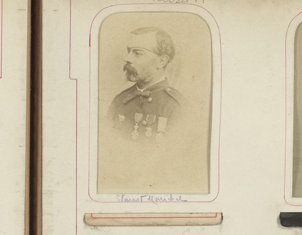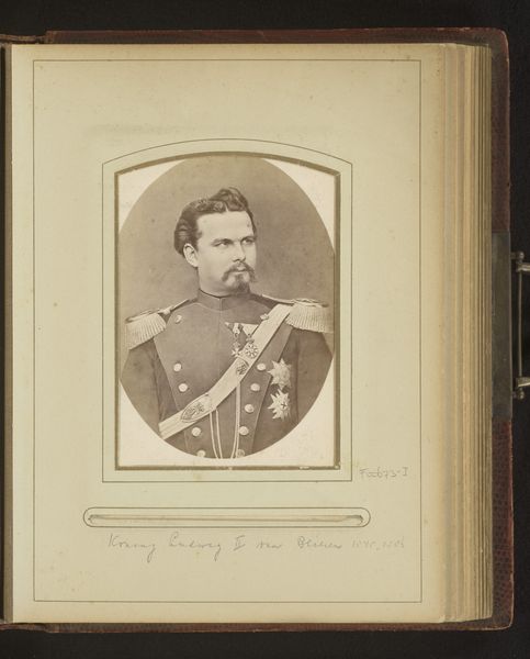 Editor: Here we have Luigi Montabone's portrait of King Umberto of Italy, an albumen print from sometime between 1878 and 1900. I'm struck by how… staged it feels, like he's embodying the very idea of monarchy through rigid posture and ornate regalia. What stands out to you in this piece? Curator: It's more than just a portrait, isn't it? It's a calculated construction of power, crafted and disseminated through photography, a relatively new medium at the time. Consider the historical context. Italy had just recently unified, and Umberto's image, reproduced and distributed, became a tool in forging a national identity and solidifying the monarchy’s authority. Look at how the light reflects off his medals, how the photograph gives off that very martial, powerful air. Who was this photograph intended to reach? Editor: Presumably a wide audience? To project stability, strength… almost like propaganda? Curator: Exactly. This photograph was meant to be consumed and believed. The albumen print process allowed for mass production, and its inclusion in albums signals its function as a collectible, shareable object. The artistry here lies in manipulating photography to craft and control a very specific narrative about the king and, by extension, the Italian state. Why present him in military regalia rather than, say, in civilian clothing? Editor: To associate the monarchy with military might, and national defense? It's a very deliberate visual message. So it's less about capturing a likeness, and more about building a persona for political purposes. I hadn't considered the distribution aspect of photography so consciously before! Curator: Precisely. The photograph as a public image is crucial, something that paintings and drawings didn’t allow to the same degree at the time. Looking closely at pieces like these is very helpful. Editor: Definitely a new perspective, thanks!