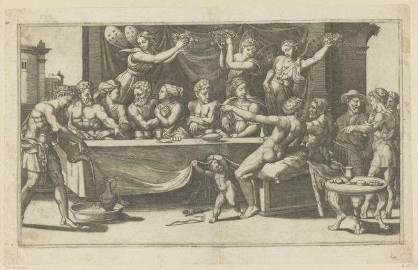 Curator: This piece, dating roughly from 1595 to 1643, is called "Macht van vrouwen," which translates to "The Power of Women." The engraving is attributed to Zacharias Dolendo and it's part of the Rijksmuseum's collection. What's your immediate response to it? Editor: It strikes me as surprisingly… unsettling. The figures are rendered with incredible detail, yet their interactions feel staged, almost like a bizarre puppet show. The nudity seems less celebratory and more like an exposure of vulnerability, or perhaps a demonstration of power, I'm not sure. Curator: Absolutely. Looking at it materially, we’re dealing with ink on paper, a readily reproducible medium even in the early modern era. Prints like this would have circulated widely, conveying ideas and allegories to a broad audience beyond the elite circles. What impact do you think this mode of production has on the image itself? Editor: The engraving process inherently flattens the scene, turning bodies into graphic symbols and amplifying certain visual cues. Notice how the lines on their bodies convey power dynamics as those that were originally engraved now tell their own tale, it speaks to me of control. Curator: That reading really resonates with me. We see women, both as figures of supposed leisure and as active agents seemingly controlling these men through implied desires and fantasies. Dolendo almost creates a debate on paper through these posed subjects, challenging and even toying with social values of the time, doesn’t he? Editor: Agreed. And look at the details—the textiles, the drapery, the accessories. The material world here is just as important as the allegorical one. This isn’t simply about lofty ideas of feminine power. It is about the world of commodities and exchange too, and about art's ability to record and sometimes, complicate these things. Curator: Complicate, indeed. To really sink your teeth into this, though, requires digging into the context of its production. Who commissioned it, where was it sold, what discussions would it have triggered? The lives that printed versions lived are part of it now. Editor: Yes, to grasp it, one must approach not just this artwork’s context but the historical forces by which its many subjects continue to confront and even haunt. Its impact ripples onward, into our present.