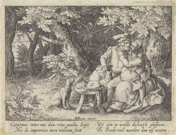 Bernard Picart created this print, Elegant Company Playing the Card Game "Jeu de l'hombre," sometime before 1733. The cool tones and intricate details evoke a sense of serenity, almost as if time stands still. Picart masterfully orchestrates the scene's structure around the card table, which acts as a focal point. The characters are arranged to create a balanced composition, while the subtle gradations in tone add depth. Notice how the lines, meticulously etched, define not only the forms but also the textures of clothing and foliage. This formal arrangement speaks to the structured social rituals of the time. The game itself becomes a metaphor for the strategies and calculated interactions within aristocratic society. The careful rendering of detail and balanced composition underscores a world where appearances and order are paramount, yet it also hints at the underlying complexities inherent in human relationships. The delicate balance within the artwork functions as a discourse on the nature of social play, where visual harmony belies potential tensions and veiled meanings.