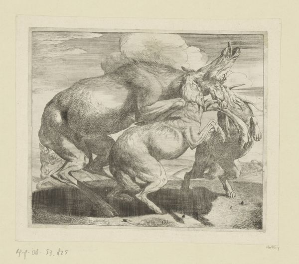John Steuart Curry made this drawing, a study for -Stallion and Jack Fighting-, with graphite on paper. Look at the energy in these marks! You can see how the artist is thinking through the motion, the struggle, making and remaking the lines, like a dance on paper. The texture comes from the sheer layering of graphite, the way Curry has built up tone and volume by hatching and cross-hatching, creating this dense, almost sculptural effect. See how the dark, smudged graphite around the horses' hooves gives a sense of the dust and churn of the fight. It's raw and immediate. The farmer with the pitchfork seems like an afterthought! You might compare this to some of George Bellows' boxing scenes, where a similar dynamism and immediacy is conveyed through expressive mark-making. But Curry's got a more down-home, midwestern feel, doesn't he? It all feels honest, like he is figuring it out as he goes, allowing for multiple readings and a beautiful sense of ambiguity.