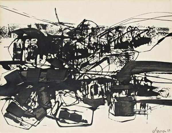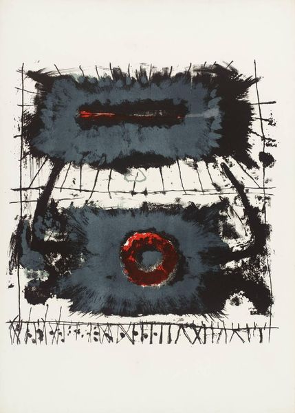 Curator: Michael Ayrton's "Greek Landscape I" presents a stark, almost desolate scene. It's a print, mostly browns and blacks, which gives it a very weighty feel. Editor: Yes, my first impression is the oppressive weight of that heavy, black sky. It feels laden with unspoken narratives, like a landscape witnessing centuries of socio-political unrest. Curator: Ayrton had a real fascination with myth and the Minotaur, so I see this as a reflection of a deeper, perhaps more tortured, psychological space. The landscape becomes a stage for inner dramas. Editor: Absolutely. The fractured forms evoke ruins, suggesting the collapse of dominant narratives. The work prompts questions around identity, power, and the construction of historical memory within landscapes. Curator: I keep wondering what those ochre and black strokes are suggesting, perhaps the very foundations of the landscape being ripped apart and re-imagined, a landscape of the mind. Editor: It leaves me considering how artists engage with inherited histories and re-present landscapes as contested spaces of identity. Curator: It’s heavy work that really sticks with you after you see it. Editor: Indeed, a landscape imbued with the weight of history and the shadow of our collective anxieties.