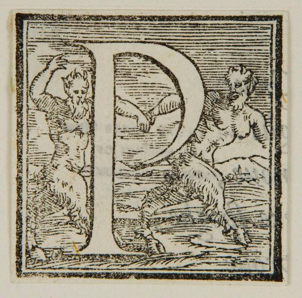 Curator: Here we have "Letter P," an intriguing, unsigned piece residing at the Harvard Art Museums. Editor: Immediately, I'm struck by the raw energy. It’s small, but it feels epic—like a tiny, chaotic world contained in a square. Curator: Indeed. This woodcut, though attributed to an anonymous artist, speaks volumes about the cultural context of literacy and image-making. The prominent "P," juxtaposed with figures, invites us to consider the power dynamics inherent in language and representation. Editor: Right? The intertwined figures are almost dreamlike, pulled straight from mythology. There is something both carnal and divine about it all, maybe a sort of primordial soup of printing! Curator: Perhaps the composition challenges established hierarchies, blurring the lines between the sacred and the profane, questioning patriarchal norms of the time. Editor: It is a captivating little enigma. It makes you wonder about all the stories it holds, the narratives it was designed to illuminate. Curator: Absolutely. It reminds us that even the smallest of artifacts can hold profound reflections on societal structures. Editor: And, sometimes, all you need is a letter to ignite a whole world of possibilities.