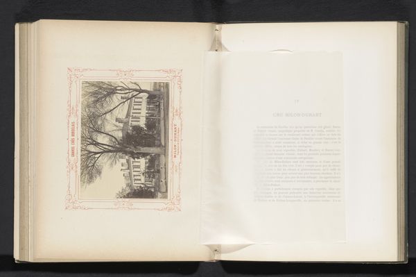 Editor: Here we have "Gezicht op Château Lafon-Rochet in Saint-Estèphe, Frankrijk," taken before 1867 by Alfred Danflou. It's an albumen print presented within a bound album. The subdued tones create quite a somber atmosphere for what I presume is a rather grand estate. What can you tell me about it? Curator: Let’s consider the albumen print itself. The process, involving coating paper with egg white, renders a uniquely textured surface. This points directly to the laborious production practices prevalent in the mid-19th century. These albums were luxury items, consumed by a specific class. What social narrative do you think this image within its physical format, the bound album, might convey about the subject of the photo, Château Lafon-Rochet? Editor: Hmm, that it’s intended for wealthy people interested in perhaps purchasing or learning more about the wine produced there? The photography serving as a promotional tool, almost? Curator: Precisely! This moves beyond mere representation. The photograph, crafted through chemical processes and meticulous labor, then bound and distributed, participates in the estate's brand. Think about the raw materials, the specialized labor, the targeted consumption, how these elements intertwine to construct the image’s value and the Chateau’s reputation. The print is as much about marketing as it is about the site. Editor: I see, so it is all about the construction of the image, the layers of physical effort and the economic exchange behind the photo that influence how it's interpreted. That's not something I had considered at first. Curator: Exactly. By examining the physical making and context of consumption, we get to the true meaning! Editor: Thanks! I’ll definitely look at photographs more materially from now on!