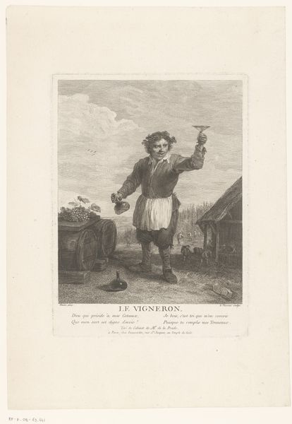 Philippus Velijn created this print, *Portret van Izaak Riewert Schmidt*, using etching techniques. At first glance, one notices a stark, detailed composition. A figure stands prominently, framed by a meticulously rendered landscape, evoking a sense of solitude and contemplation. Velijn employs a structured approach, balancing light and shadow to define form. The subject is depicted with a focus on linear precision, his posture and attire carefully outlined to convey a sense of authority. The surrounding landscape, though detailed, serves as a backdrop, emphasizing the figure's isolation. This formal arrangement invites us to consider the interplay between individual and environment. The composition's structure destabilizes conventional portraiture. It challenges fixed meanings associated with power and identity. Velijn’s work prompts us to reconsider the relationship between representation, cultural context, and individual experience. The print's meticulous detail and structured composition reflect broader philosophical concerns about identity. It offers a site for ongoing interpretation and re-interpretation.
