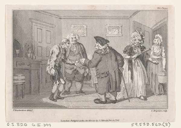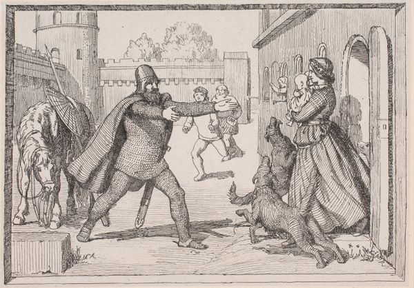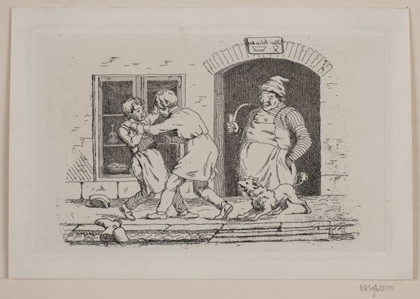 Curator: Looking at this image, my initial reaction is one of mild amusement tinged with concern. The two boys in the foreground, caught mid-scuffle, seem almost cartoonish, while the adult figure looming nearby strikes a slightly ominous chord. Editor: Well, that "ominous" figure certainly holds visual weight! Here we see Julius Exner’s pen drawing and print, dated 1862, "Illustration til Billeder og Vers af Julius Exner og Christian Winther," housed here at the SMK. Let's dig a bit deeper. I'm drawn to the artist's skillful use of line to create texture and depth in this seemingly straightforward depiction of genre. Curator: Exactly! The print portrays a scene that could easily be found in the streets of 19th-century Copenhagen. Exner, of course, often depicted scenes of everyday life among the peasantry, but the staging here feels deliberate. I wonder about the influence of the art market. Was there a demand for "charming" scenes of working-class life among the bourgeoisie? Editor: The question is whether this reflects reality, or some kind of fantasy… But focus on what stands out. It's the way the artist depicts the brawl - the energetic scribbles rendering the struggle, the contrasts in weight—heavy, scratchy outlines around the adult figure against the thinner, cleaner strokes that define the children. What’s your sense of how this was made and what this suggests? Curator: Certainly, the clear depiction of class differences comes into play, which suggests the distribution of social roles and control, right? Look at that smug expression of the observer with his pipe; the boys can engage in fisticuffs, but in the end, he controls things. He represents institutions… Editor: Institutions rely on specific processes! We need to recognize Exner's engagement with his medium –the meticulous details achieved with the pen. The contrast of textures, for example, the smooth wall versus the rough cobblestones or the frenetic dog, brings attention to both the artistic skill and labor inherent in creating such prints for mass consumption. It really challenges traditional divisions in art, blurring "high art" with common labor and mass-produced materiality. Curator: So, we are brought back to social roles reflected through art making… But, of course, also influencing attitudes and behaviors in public. Editor: Right, these kinds of pieces are important to really unpack a time, in materials and mores. Thanks for providing insights into how society receives such work.