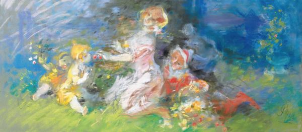 Curator: Well, that’s quite enchanting! It's light, airy, almost like a daydream captured in paint. The colour palette alone is quite beautiful and calming. Editor: It is indeed. This is "The Farandole," a work attributed to Jules Chéret, crafted in oil paint. While the date remains unspecified, its style firmly places it within the Impressionistic movement, and perhaps hints at the Romantic. Curator: "The Farandole," fitting given the feeling of movement, the suggestion of dancing. Look at the central figure – she seems almost ethereal, floating rather than walking. The lightness of her dress against that blue and yellow backdrop enhances this sense of levity. I’m intrigued by how symbols of youthful, perhaps innocent celebration is conveyed here. Editor: Absolutely. Considering Chéret’s historical context, we must see him in the Belle Époque, and this imagery is reflective of its optimism, hedonism, its evolving social mores. There's the aesthetic pleasure for the elite, sure, but there’s also this tension as modern life began encroaching with the new century. His work represents the changing position of women, particularly, from the mid-19th into the early 20th century. Curator: Yes, a pivotal shift in representations! The image teases the feminine ideal that would dominate commercial life. The way she looks upward, for example, lends itself to the idea of aspiration, possibility. Does it celebrate freedom or further enforce constructed ideals about beauty and worth? Editor: That’s the crucial point: how did works like this shape perceptions, not just reflect them? I wonder what these kinds of scenes mean when they saturate urban life. They become less reflections of values, and perhaps help to shape them and direct society as a whole. Curator: It almost certainly plays a dual role – mirroring and molding. The repetition imbeds certain expectations, certain desires. The art creates an emotional connection and cultural understanding about women and societal power, perhaps, too. Editor: And its ongoing display, in the past as posters but now with digital copies across the Internet. Curator: Exactly. Examining such images becomes an act of cultural excavation – unearthing those subconscious associations. What is it about lightness, grace, and youth, these feminine associations, that hold our collective gaze? Editor: And it reminds us of the power art possesses, to frame—and potentially, to free us from, limiting viewpoints. Curator: Precisely. Understanding this is essential to charting a more thoughtful path forward.