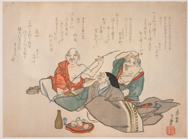 Curator: Immediately, there’s such a gentle, domestic feeling that washes over me, looking at this composition. It reminds me of coming across someone's carefully curated possessions on a tray. Editor: It’s intriguing, isn't it? This woodblock print, "Spectacles and Telescope with Cases" by Ryūryūkyo Shinsai, dates back to the 19th century and offers us a glimpse into the everyday life of the time. It's currently held in the collection of the Metropolitan Museum of Art. The focus is on the implements that extend our perception and awareness. Curator: Yes, the spectacles are kind of like an early extension of ourselves, a beautiful precursor to something like a smartphone, yet they’re imbued with a sense of handmade quality and careful craft. I imagine the owner being meticulous, observant, perhaps a bit eccentric, keeping everything orderly. I can practically hear them humming while polishing the lenses. Editor: In its era, ukiyo-e prints like this one held immense appeal. Beyond their artistic merit, these images were readily reproducible and became essential tools for disseminating ideas and fashion, especially amongst the burgeoning merchant class. They facilitated access to refined cultural tastes. The poem inscribed here only underscores this intention to offer and invite cultured insight. Curator: Oh, absolutely. It feels like a celebration of quiet pleasures and pursuits. Maybe stargazing from a hidden garden, reading under a soft lamp light, these objects really whisper a longing for intimate knowledge and personal experience, a real tenderness for how we encounter the world. I feel calmed just gazing at it. Editor: It is really interesting to consider this art from a current viewpoint where the democratization of vision tools is accessible to such a wide demographic. Where telescopes can peer far out, but spectacles are used for personal vision. This historical capture provides such interesting material about the era, the politics and also personal aspirations. Curator: Yes. This intimate encounter with everyday objects gives us a special aperture into our history. Thank you for guiding us through it. Editor: Thank you!