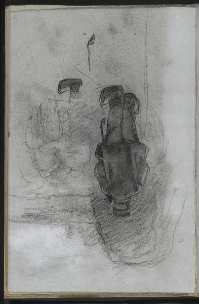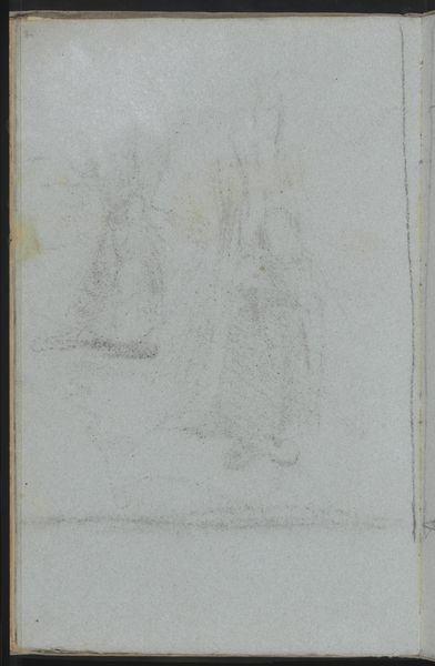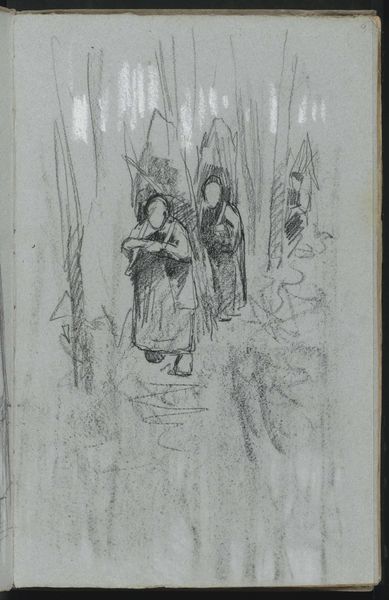 Curator: I’m immediately drawn to the overall somberness of this drawing, a palpable weightiness conveyed despite its light and sketchy quality. Editor: Well, this is a pencil drawing, “Twee vrouwen met takkenbossen op een pad,” or “Two Women with Bundles of Brushwood on a Path” by Willem Witsen. The Rijksmuseum holds this work, which dates from around 1884 to 1887. Curator: Witsen really captures a feeling of hardship here. Look at how he renders the women; they appear burdened not only by the bundles of wood but also by life itself. Their forms seem to emerge from and recede into the landscape. There’s an incredible unity between humanity and environment suggested. Editor: I agree. You can see the impact of social realism, positioning the working class within their daily toils. Consider the broader societal implications. These women were likely essential for their family’s survival, engaged in labor that reflects limited opportunities and social inequities within Dutch society at the time. Curator: Precisely! It speaks to how we often view labor through a purely economic lens. I think Witsen's sketch gives a quiet dignity to these women. Look how he implies rather than explicitly defines them. The symbolic resonance for me lies in these undefined areas: memory and tradition both carried and then forgotten. Editor: That echoes something of their historical invisibility, doesn't it? Yet, by representing them, Witsen grants them visibility, challenges that very erasure. It opens dialogue surrounding class, gender and the power structures inherent in representing labor. Curator: Indeed. Ultimately, I think this quiet piece captures a deep sense of empathy, even if executed simply. Editor: For me, it's the start of a continued reckoning, forcing us to look beyond bucolic representations of rural life towards a more critical awareness.