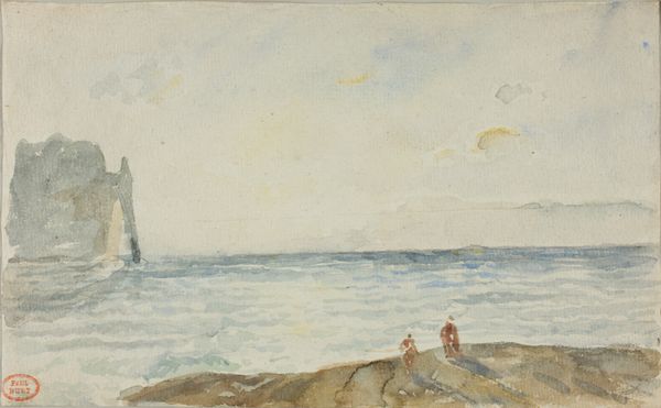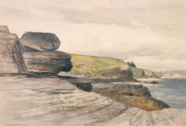 Curator: Standing before us is a work entitled "Rocks and Shore" by Nathaniel Hone the Younger. Executed with oil paint, it immediately suggests the artist's commitment to the plein-air approach and reflects impressionistic stylistic qualities. Editor: It strikes me as somber, even a bit melancholic. The muted palette and the rough, almost chaotic brushstrokes give it a sense of being unfinished or in progress, like a fleeting moment captured quickly. I see dark water dominating most of the composition and there seems to be an implied contrast with a paler sky above. Curator: Absolutely. Hone's embrace of Impressionism and landscape painting took him outdoors to observe the fleeting effects of light. It marks a shift away from the structured, studio-based art that dominated academic painting at the time. He worked with thick applications of paint on-site to capture this dynamic sense of light and atmosphere. The piece is not as much a literal depiction of a place as an artistic study of what he was seeing and feeling at the time. Editor: It really draws me to thinking about the kind of labor involved to even achieve such a picture in such conditions; just imagine lugging those materials to a rocky shoreline to work en plein air and how physically taxing it must have been to complete even such small paintings. Curator: Certainly, and let's consider the art market too. Artists who painted scenes like this helped popularize the countryside and seaside as leisure destinations, which aligns neatly with the rise of tourism in late 19th-century Ireland. The appeal resided not just in the scenes, but in the status of owning paintings rendered using impressionistic plein-air techniques. Editor: The facture feels so present—all that visible brushwork and the earthy tones make you consider the painting’s existence as object, not just image. Curator: The work, while seemingly small and humble, invites questions about art's role in shaping cultural perceptions of landscapes, its connection with broader economic shifts, and its capacity to influence society. Editor: I leave with an appreciation for how materials and production can offer access to different ways of thinking about land and leisure. It provides a way for us to understand that a place exists due to our complex involvement. Curator: A perfect reflection on art, its socio-historical implications, and enduring visual appeal.