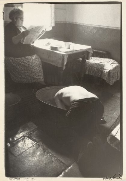 Curator: Russell Lee’s poignant photograph, “Milong Bond Taking a Bath,” captures a striking scene. The image, housed at the Harvard Art Museums, measures about 26 by 33 centimeters. Editor: Immediately, I’m struck by the intimacy, the vulnerability. The light catches the curve of his back, but it’s a harsh light, unforgiving. Curator: Precisely. The composition is stark, almost brutal in its realism. Note the peeling paint, the worn wooden floor—elements contributing to the overall narrative. Editor: It’s poverty made visible, but there’s also a quiet dignity here. He’s performing this basic act of self-care despite the circumstances. Curator: The galvanized steel tub acts as a framing device, confining him within the shot while highlighting the textures. The contrast between skin and metal is profound. Editor: It reminds me of a Hopper painting, that same sense of loneliness, but amplified by the grittiness of documentary photography. Curator: A compelling assessment, focusing our view on the core elements of form, structure, and social context. Editor: Absolutely. There’s a story etched into every shadow and line in this picture. It resonates.