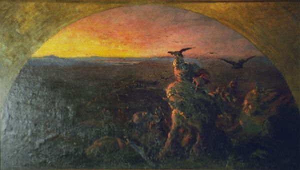 Editor: Right, so this painting is titled "Night Two Stags Battling by Moonlight," attributed to Edwin Henry Landseer. I get this really dramatic, almost gothic feeling from it – the clashing stags under this eerie moonlight. What do you see in this piece? Curator: Gothic is a lovely word for it! The painting whispers tales of dominance and struggle, doesn't it? Look how Landseer uses light, almost theatrical, pinpointing the primal conflict. But it’s more than just observation; there’s a raw emotion simmering. Have you ever felt that instinctive urge to fight for something you believe in, even under the pale glow of uncertainty? Editor: I think so. The moon definitely adds a layer of mystique… it makes the scene feel timeless. Is there a connection to Landseer's other animal paintings? Curator: Absolutely. He was a master of anthropomorphism, wasn't he? Bestowing human-like qualities on animals, inviting us to reflect on our own natures through them. These stags, locked in combat, become emblems of ambition, rivalry, and perhaps, the fleeting nature of power itself. What does their struggle remind *you* of? Editor: I guess… it kind of echoes those power struggles we see in politics, or even within friend groups sometimes. It's almost Shakespearean! Curator: Exactly! Art's clever, isn't it? Mirrors up to the world, using stags in Scotland to speak about all humanity. Now I'm wondering… if these stags could talk, what stories would they tell? Editor: Wow, that gives me a whole new perspective on the painting! I’ll definitely look at his other paintings in a different light, thanks. Curator: It's my pleasure entirely. Keep pondering and I'll meet you at our next masterpeice.