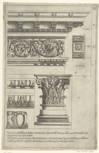 Editor: This is "Ionic Capital, capital and base" an engraving on paper made in 1636, currently held at the Rijksmuseum. It feels very precise, like a technical drawing. What aspects of its composition strike you most? Curator: Immediately, I am drawn to the interplay of line and form. The rigorous, almost mathematical depiction of the architectural elements supersedes any representational purpose; its lines defining volumes that adhere to classical ideals of order and proportion. Editor: Could you expand on that, particularly concerning the “classical ideals”? Curator: Observe the structural clarity: the clear demarcation of the base, the shaft (implied here through the capital), and the entablature. Each part adheres to a strict visual logic. What we see isn’t simply a depiction of an Ionic order, but an exploration of its constituent geometric forms. The engraving style itself lends to this—the precision of the lines allowing for a clarity of form rarely achievable in looser media. Does that resonate with your initial thoughts? Editor: It does! I didn't think about how the medium enforces the classical style. Curator: Indeed. This work is a masterful semiotic exercise: each line, each curve signifies a calculated architectural principle. Through this, it presents us with an abstracted ideal rather than merely a representation of a building component. It asks us to contemplate the inherent forms and their relationships. Editor: I see it now! This conversation made me think differently about engravings! Curator: Excellent. Considering this level of detail really provides a new understanding of formalist representation.
