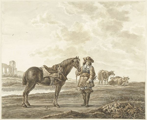Abraham Delfos created this harvest scene with pen and watercolor. At its heart is the motif of collective labor and rest. It's a scene marked by a feeling of abundance and the human connection to the land. Consider the reclining figure surrounded by solicitous companions. Throughout art history, this arrangement echoes depictions of mourning or care, from depositions of Christ to scenes of injured warriors tended by comrades. The gesture of support, the gentle touch, the compassionate gaze — these are enduring expressions of human empathy. The prominence of the harvest itself evokes ancient fertility rites, with roots stretching back to Demeter and the Eleusinian Mysteries. The cyclical rhythm of planting, growth, and reaping is an eternal story of renewal. Observe how Delfos imbues this seemingly simple scene with a powerful sense of shared humanity. The image serves as a conduit for these deeply ingrained cultural memories. It's a reminder of our primal connection to the earth and the enduring power of community.