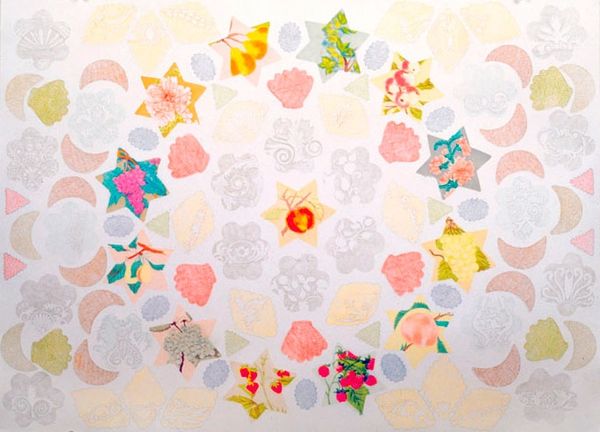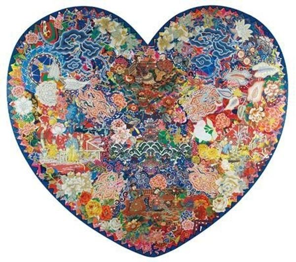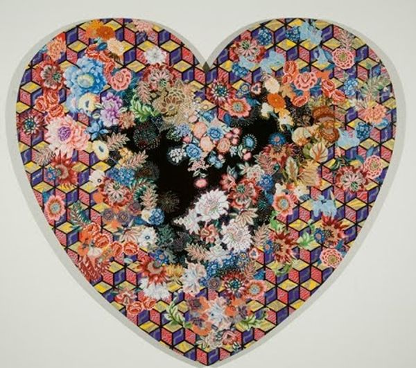 Miriam Schapiro made this heart shaped artwork named 'Baby Block Bouquet' with paint and collage. The way she combines these patterns and colors? It feels like a process, you know? An investigation. Up close, you can see how the baby block pattern forms a frame for the florals, and how she used all these different colors to create a kind of organized chaos. I love the black center, it makes the surrounding colors pop even more. It’s like she’s saying that in art, as in life, contrast can be beautiful. The whole piece feels playful, like a child's quilt, but it also has this real depth to it. It reminds me a bit of the work of Yayoi Kusama, with its obsessive patterning and focus on color. But Schapiro's work is all her own, a unique voice in the ongoing conversation of art.