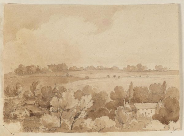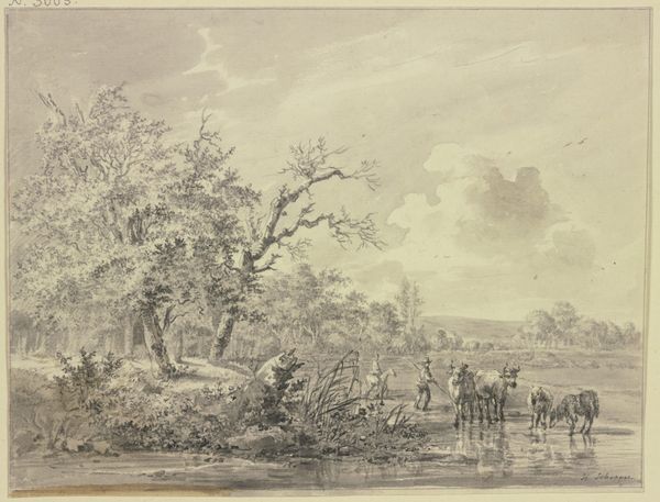Curator: Friedrich Wilhelm Hirt’s "River Landscape in Moonlight," rendered in ink on paper, offers a glimpse into a serene nocturnal scene. Editor: My first impression is that it feels hushed. Almost monochromatic. The gray tones wash over the whole scene like a memory, blurring the edges. It gives me this quiet feeling, like the whole world is holding its breath. Curator: I'm interested in your mention of memory, that evokes Romanticism doesn't it? Think about how this drawing, although technically not dated, comes from a time obsessed with capturing an idealized, often melancholic version of nature and the past. Look at the tiny figures scattered near the distant church. Are they really present in the artist’s time, or perhaps ghosts haunting the landscape? Editor: Ghosts is the perfect word! It does feel haunted, but in a cozy way. The drawing style is light and airy. Even though it’s monotone, you still sense so much texture, so much space. And that little boy near the fence, looking out over the water! There is so much human feeling. A feeling of watching and waiting, perhaps for someone. It makes the scene feel alive. Curator: Yes, alive even in stillness, because these Romantic landscapes gave agency to humanity as part of nature! And isn’t this feeling reflected institutionally in museums that allow people to contemplate the very act of watching, of interpreting a constructed scene in such an isolated way? What do we project on a landscape we only know through this rendering? Editor: That’s profound! It’s like, we're not just looking at the river; we're looking at Hirt's experience of it, and filtering it through our own lens. The magic, I suppose, is finding common ground in these personal visions. Curator: Precisely! And art becomes this social and historical dialogue, a space of contemplation that connects individual reflection with broader cultural narratives. Editor: I think my breaths are even quieter now. It really is like we’re sharing this space that Hirt opened up, here and now, over hundreds of years. Curator: And in this suspended time we leave this journey into the shadows of human affect.