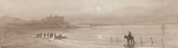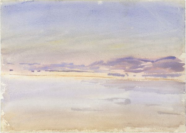 Curator: This delicate watercolour is titled "River Landscape with Town on Far Shore" by Edwin Austin Abbey. What are your first impressions? Editor: A dreamscape. The pale blues and browns blend, creating a hazy, almost ethereal feeling. It's so quiet and muted; a real escape. Curator: Indeed. It is representative of the late 19th-century trend toward impressionistic landscapes, with an emphasis on light and atmosphere rather than sharp detail. These works provided middle class people the possibility to think and discuss social stratification. Editor: The sailboats feel almost ghost-like, distant and fading. Was this intentional, perhaps alluding to a commentary about capitalism. I’m thinking that they might have been there as luxury ships. The town is a pale whisper along the horizon. Curator: Absolutely. Abbey was a successful illustrator before turning to such watercolors. Therefore it might have something to say. While the impressionistic style valued immediacy, the commercial art world favored idealized representations. The piece seems in line with popular narratives around beauty and pleasure available for anyone at the time. Editor: It strikes me how passive and inviting the landscape is. Almost like beckoning us. Could this relate to discourses of empire? I can almost feel how they treated indigenous peoples, and then took it for themselves, while claiming an idyllic view for all? Curator: This invites further interpretation regarding what kind of cultural identity such painting encouraged. Abbey enjoyed significant patronage. His work in illustrating Shakespeare’s plays was widely celebrated. He then served public roles, often creating works with popular messages. This would add weight to your claim about colonial ideologies! Editor: It speaks to art’s constant role, for better or worse, in society. I'm sure we will be exploring further works along these themes throughout our museum tour. Curator: Let’s do it! On to our next analysis.