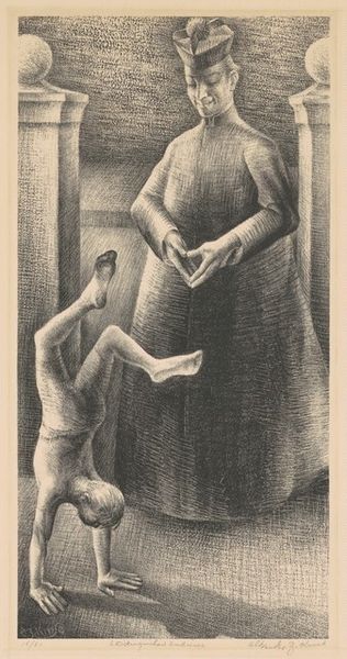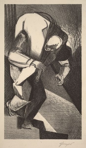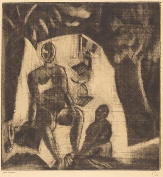 Glen Alps made this print, called Meditation, using a technique called collograph. It's a process where the image is built up through layers and textures on a board, then printed. The way Alps has worked the surface here, it almost feels like he's coaxing these figures out of a haze of tiny marks. The mood is somber, right? You can feel it in the downcast gaze of the figures, in the way the light seems to cling to the surfaces. It's like the whole image is breathing, thanks to the texture. Look at the way Alps renders the folds in the clothing, or the way he creates depth in the shadows – each tiny mark contributes to the overall feeling. The hand holding what I take to be a piece of meat, looks almost sculptural and quite strange. The way Alps coaxes the image out of the plate reminds me of Max Beckmann, who was also interested in psychological intensity. In the end, though, this piece really holds it's own, floating in a mysterious psychological space.