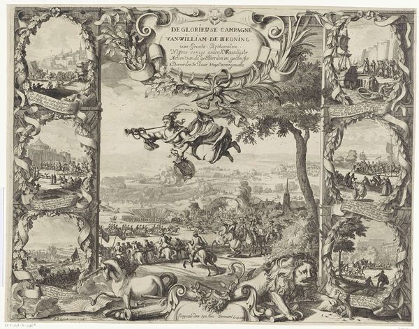 Etienne Delaune created this engraving titled 'Juni' sometime in the 16th century. The balanced composition, with the rural scene nestled within an ornate border, immediately draws the eye. Delaune masterfully uses line and form to construct a detailed narrative. Notice how the central scene, depicting rural life and the shearing of sheep, is framed by a decorative border teeming with objects and figures. This contrast invites us to consider the relationship between the everyday world and the realm of artistry and artifice. The print operates on a semiotic level, where each element functions as a sign. For example, the tools and produce within the border act as symbols of labor and abundance. The meticulous detail creates a dialogue between the central image and its frame, questioning the boundaries between representation and reality. This challenges fixed meanings and allows us to view familiar themes through a complex, multi-layered lens.