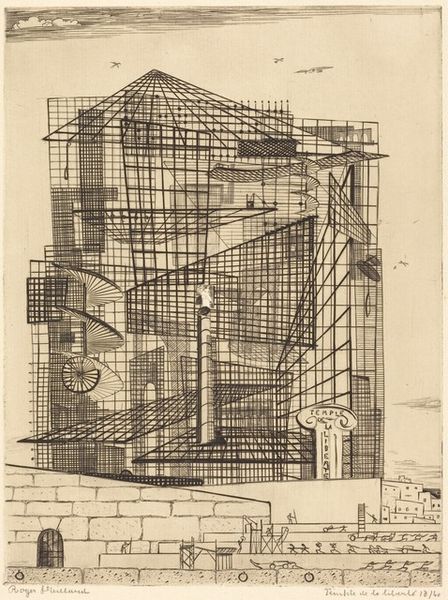 Curator: Here we have Bernard Greenwald's etching from 1965, titled "Room". It's a fascinating example of the artist engaging with modernist abstraction through printmaking. Editor: It feels… unsettled. The geometry is present but chaotic; the varying tones created by the etching feel more anxious than organized. Curator: That tension might be intentional. Greenwald created this during a period of significant social upheaval. The work's cubist leanings allow for a fractured perspective, a reflection perhaps, of the fragmented sense of reality prevalent during the Cold War era. The room, normally a place of refuge, seems almost hostile. Editor: I agree. Looking at the composition, I see a fascinating interplay of positive and negative space. The heavy lines create strong geometric shapes, but the emptiness within these shapes is equally powerful. I'm particularly drawn to the circle near the top; it is the sole curved line in a network of rectilinear lines, a break in the established grid. Curator: And consider how the artist's choice of printmaking impacts the piece's reception. The inherent reproducibility of print allows the image to disseminate, becoming more accessible and embedding itself within the broader cultural landscape. Greenwald used etching, but why this medium and not lithography or screenprint? It adds layers of historical depth and symbolism. Editor: The use of etching gives this “Room” its distressed beauty. The textures created from the etching process give a hand-made effect, emphasizing that we are, in fact, observing an architectural abstraction, with linear perspectives flattened into planes. Note the visual weight that shifts across the surface due to tone differences; light struggles for purchase within the geometric network of dark line and shadowed shapes. Curator: Absolutely, and Greenwald’s focus on form—pure geometric form—isolates these architectural signifiers from function. Stripped of their intended purpose, what remains is the disquieting aura of a built environment divorced from human comfort or intent. It challenges the role of architecture as both physical shelter and ideological framework. Editor: It is an impressive print that makes one think, not only about geometry, but also about negative space and mark making; what constitutes a constructed reality? Curator: The artist made the room a vessel for ideas and questions, very telling. Editor: I appreciate you providing socio-cultural contexts, it gives greater depths to my formal assessment of lines and composition.