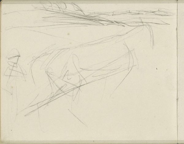 Editor: Here we have “Vrouw, schetsend achter een tekenblok,” or "Woman, Sketching Behind a Drawing Pad," created sometime between 1865 and 1913 by Bramine Hubrecht. It’s a pencil drawing currently held at the Rijksmuseum. It feels unfinished, a fleeting impression caught in the moment. What do you see in it? Curator: I see echoes of artistic forebears and nascent symbolisms wrestling for dominance. The red pencil, a somewhat unusual choice for preparatory sketches at the time, already hints at a break from tradition, an emerging voice using colour not just for accuracy but expression. Think of red's potent history - blood, passion, revolution... Editor: Revolution? In a sketch of a woman drawing? Curator: Perhaps not overtly. But consider the gaze. It's averted, internal. Women artists of this era were beginning to explore not just outward representations but inner lives, subjective experiences. What’s the emotional weight carried by artists who look to look? Editor: That’s a good point. The woman’s hidden face almost suggests she’s guarding something. Her thoughts, perhaps? Curator: Exactly! The act of drawing becomes a symbolic shield, a way to process and mediate the world. And the sketch itself, incomplete as it may seem, is a record of that internal journey. The sketch mirrors the self looking to project. It mirrors itself, doesn't it? Editor: It certainly gives me a lot to think about. I initially saw it as a simple sketch, but now I see it as a symbolic statement. Thanks! Curator: A statement about silence that reveals memory: precisely. It was a pleasure.