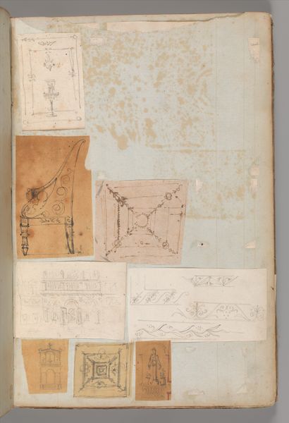 Curator: It feels like stumbling into an architect's dream journal. Faint outlines of facades, doorways leading to nowhere, all floating on a creamy sea of paper. There's something both exhilarating and slightly melancholic about it. Editor: This is a page from a scrapbook by Charles Percier, created sometime between 1795 and 1805. It’s a medley of drawings and prints, all interwoven on paper using ink. We find it at the Metropolitan Museum of Art in New York. What we are viewing gives insight into architectural neoclassicism at the turn of the 19th century. Curator: Ah, Percier! Of course. That explains the confident lines, the emphasis on classical forms. I get a sense that the artist reveled in ornamentation—the scrolls, the columns, all these embellishments. Is that brown ink that he has applied for the broad structure? Editor: Yes. And beyond being aesthetically driven, we see in this page a dialogue with architectural and design publications which experienced explosive growth during this period. These designs could easily be seen to communicate status, reflecting emerging bourgeois desires. Curator: Interesting. It almost reads like a Pinterest board from the period, where ideas are gathered and presented to future clientele! Seeing this interplay between social aspiration and artistic process, I think there's something deeply resonant about encountering an artist's unbridled curiosity. Editor: Precisely! The apparent disorder reflects the socio-political chaos of Revolutionary France giving way to Napoleonic aspirations of Empire, and it also encapsulates that transition from old modes of aristocratic life into this newly burgeoning social identity. Curator: Looking at all those different scales crammed together, a question bubbles in me...how many of these ideas were put into reality? Are these records of built form or simply fanciful ideas from Percier's imagination? Either way, my brain sparks with ideas and a feeling of artistic and individual liberation. Editor: It's that liminal space – existing as both blueprint and daydream, functional design and artistic flourish, that renders it truly unique. Ultimately, this seemingly casual arrangement challenges how we classify the very idea of what we now recognize as artistic intent in the modern museum era. Curator: It truly is more than meets the eye at first glance; such a rich little portal into history. Editor: Indeed. It’s amazing how a simple scrapbook page can open up such grand vistas.