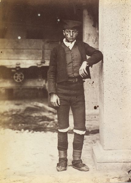 Editor: Here we have "Theodore Ferris [recto]," a gelatin silver print photograph taken around 1869, likely by George K. Warren. There's a somber, posed quality to it, almost staged. What strikes you most about this image? Curator: This image speaks volumes about the intersections of race, labor, and representation in post-Civil War America. Looking at Theodore Ferris, carrying goods marked "Yale Confectionery," invites questions about the economic and social landscape of the time. How did institutions like Yale utilize Black labor, and what did economic opportunities look like for Black men then? Editor: So, you see this less as a simple portrait and more as a document of social conditions? Curator: Exactly. Photography in this era was often used to perpetuate stereotypes. We must ask, what agency did Ferris have in this portrayal? Is this an attempt to depict respectability, or is it a visual inscription of the racialized labor force? Consider the gaze, his posture, the context of the "Yale Confectionery" box. They all construct a narrative. Editor: The fact that it’s a gelatin silver print makes me wonder, how did that process affect how people were portrayed? Curator: The availability and affordability of gelatin silver prints broadened photographic representation, but didn't necessarily democratize it. While more people were being photographed, the power dynamics behind the lens often remained unchanged. Editor: That’s a perspective I hadn’t fully considered. It's more complex than just a historical image; it’s about power, representation, and the nuances of labor. Curator: Precisely! Analyzing images like these allows us to dissect the complex tapestry of identity and work towards a more equitable understanding of history.