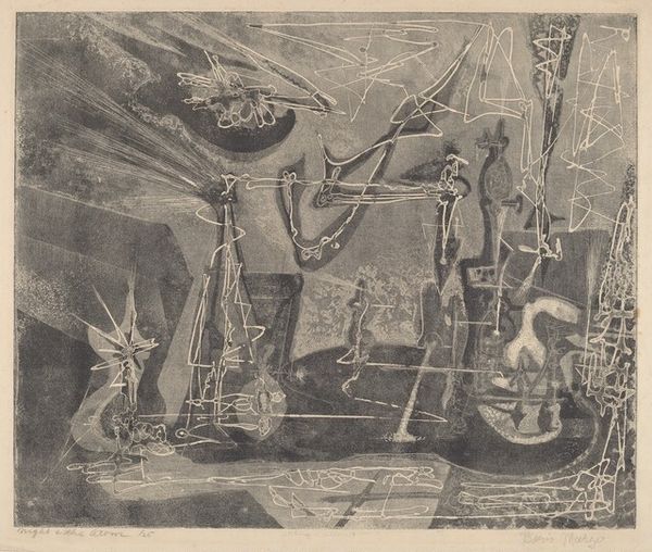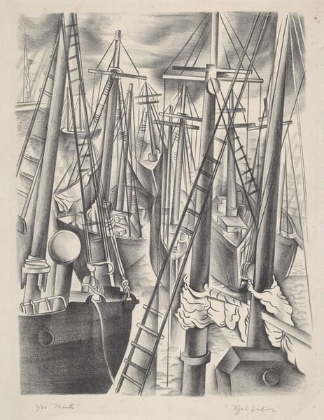 James Downey Egleson made this print, Night, Steel and Sleep using woodcut, a process that involves carving a design into a block of wood, inking the surface, and then pressing it onto paper. It’s a technique with a long history, particularly well-suited for bold designs. The woodcut process lends itself to strong, graphic compositions, and here the sharp lines and contrasting colors powerfully evoke the industrial setting and the weariness of the workers. The scale of the steel structures dwarfs the sleeping figures, emphasizing the relentless nature of their labor. You can almost feel the weight of the machinery and the density of the night. Egleson’s choice of this medium underscores the relationship between labor and the means of production. Woodcut, while capable of great artistry, is also a relatively accessible and democratic medium. The print resonates with the dignity of work, and yet also conveys its physical toll. The artist has captured a profound commentary on the human condition.