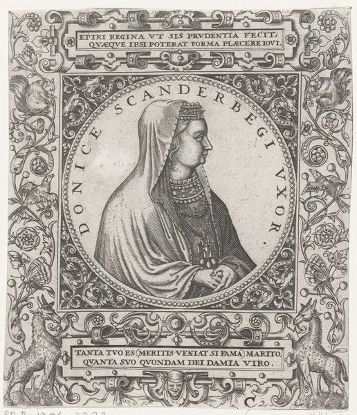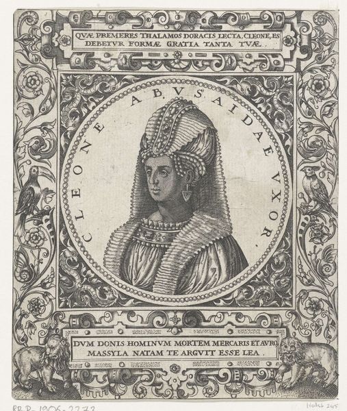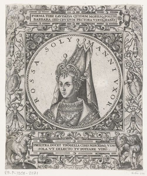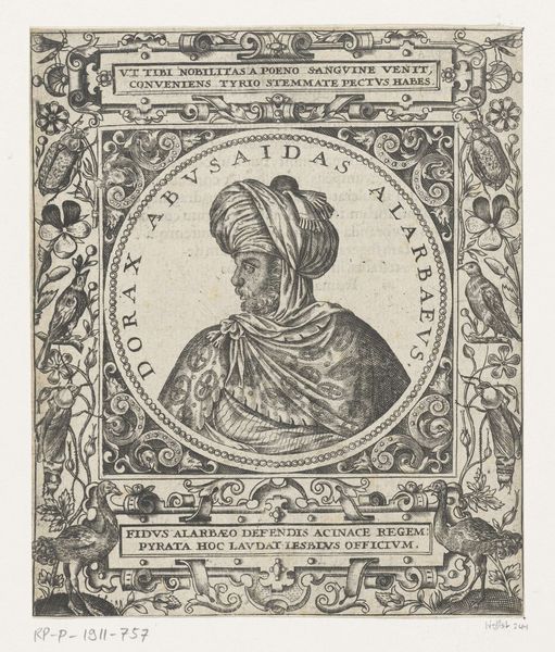 Curator: What a find! Here at the Rijksmuseum, we have "Portret van Bartolus de Saxoferrato", a baroque engraving by Theodor de Bry dating back to sometime between 1597 and 1669. Editor: Wow, it looks like a woodcut, all those intricate lines. He has this look, kind of like he's already figured out the answer to a question nobody's even asked yet. Is he wearing a bathrobe? Curator: More like academic robes. Bartolus was a highly influential Italian jurist, and this print is rife with symbolism. See the bees and butterflies in the ornate border? Editor: Oh, I missed those. But tell me, what are *they* doing here? Because I’m getting less ‘law’ and more 'abundance and fleeting beauty' from them! Curator: The insects may reference diligence and metamorphosis, fitting tributes to a legal scholar. Remember, baroque art loved to pack layers of meaning. Editor: That makes sense; even the lettering that wraps around his head feels so meticulously crafted, like each stroke has a purpose. Though, I still get a slightly sleepy vibe from his expression, as though law school was boring even back then. Curator: It does suggest deep thought, doesn't it? It reflects the weight of centuries of legal tradition he carried, interpreted, and reshaped. His legacy still ripples through modern law. The engraving shows that permanence. Editor: A visual statement on his lasting effect! And there’s something lovely in seeing how someone saw and wanted to remember him, so many years later. Curator: Indeed. It connects us to intellectual history. Editor: Exactly. It shows how we choose to memorialize even our eggheads. It's been such an insightful discussion, that robe really distracted me at the beginning but this historical approach opened another door!