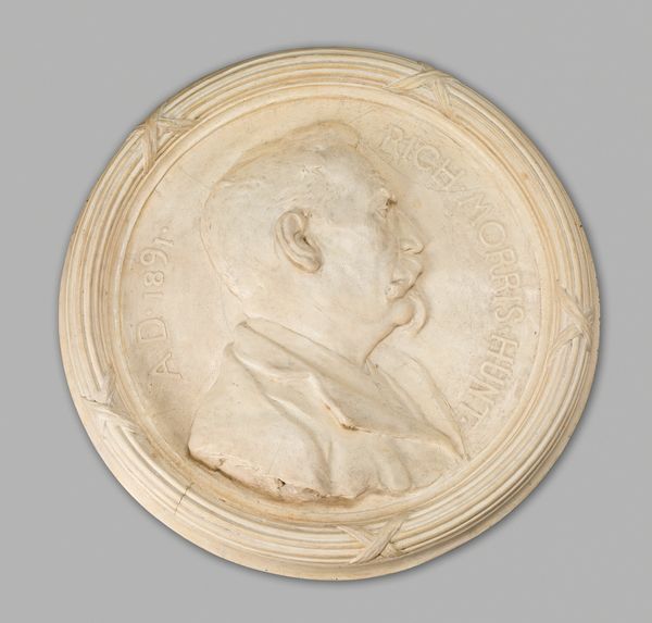 Editor: Here we have Harald Conradsen's relief sculpture, "Billedhuggeren J.A. Jerichau," dating from 1850 to 1852. Crafted in terracotta, the work presents a portrait of the sculptor Jerichau. The texture is compelling, a kind of austere elegance in this muted palette. What are your thoughts about the composition here? Curator: Immediately striking is the formal restraint. Conradsen employs the circular format not merely as a boundary but as a frame, enhancing the central form, that is the figure itself, almost forcing a singular point of view. This restricts perspective, compelling viewers to acknowledge not just the subject but also the physical, palpable object. Note also how the planar construction enhances clarity and linearity, minimizing illusion. Editor: Yes, and what does the reduction to this singular colour accomplish? Curator: Precisely, consider the monochrome terracotta; it negates distractions, shifting the focus from mere likeness to form itself. See how the contours are clean, unbroken; a neoclassical serenity, devoid of romantic exaggeration or subjective effusion. What significance might the restricted tonal range present, if any? Editor: I hadn’t thought of it this way, but I suppose the choice of one colour and material, terracotta, accentuates the texture. It becomes about the play of light on form, the manipulation of material. Curator: Exactly, Conradsen draws awareness to the sculpted form. His purpose transcends that of an accurate depiction of the subject: this relief presents itself more like an essay in pure formal ideation, the material embodiment of order and proportion. Editor: Thank you! Now I'm much more aware of the compositional construction in the piece.