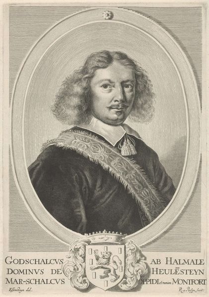 Curator: I’m struck by the textures; the almost velvet rendering of the gentleman's robe contrasts vividly with the crisp, staccato lines used for the background. What's your impression? Editor: Well, examining this print, "Portret van een man in ovaal," attributed to C.A. Tuchs, possibly dating to 1867, I find it intriguing, almost haunted. The detail of the man framed in that oval is very striking. Curator: Yes, and within that oval, the symbolism is quite loaded. The portrait evokes a visual language drawn from baroque sensibilities, but printed in the 19th century! The sitter's pose, gazing over his shoulder, hints at introspection, or perhaps defiance, characteristic of the period of upheaval when old structures are giving way to something new. Editor: Absolutely. And think about the labour involved. Each line of that background, each stroke defining the folds of fabric—it’s an engraving, painstaking work with specific tools, producing an image that could be reproduced, distributed, and consumed. Curator: His collar and robes seem like a code of privilege and distinction in baroque culture. Note the armorial emblem below the portrait. It creates an interesting commentary on hierarchy and lineage. There’s a performative aspect here: this is a statement about belonging, status, identity captured for posterity. Editor: It's more than just status, I believe, it's about the accessibility of the art itself; who could afford paintings and portraits versus a print? Curator: So, we are witnessing how an artistic convention can endure as an archetype through various times, continually reshaped with meaning based on social conditions. The baroque era's emphasis on splendor becomes reimagined in 1867 as a yearning for times past? Editor: Or, maybe a cynical replication, mimicking a style without necessarily the political baggage it first carried, making such images easily obtainable for different buyers than they used to be. Curator: It seems we can agree it still holds power to resonate, either due to our collective memories or despite them! Editor: Indeed.