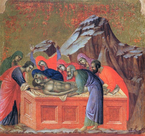 Duccio painted this fragment of the "Lamentation of Christ" around the early 14th century, capturing a scene laden with profound sorrow. Note the motif of raised hands, a gesture of extreme grief seen throughout antiquity. In ancient Roman funerary art, figures often appear with arms outstretched, beseeching the heavens. Similarly, Mary's embrace of Christ's body echoes the ancient motif of the Pietà, where maternal love confronts the stark reality of death. This configuration taps into our collective memory, resonating with primal emotions of loss and compassion. Consider the symbolism of Mary Magdalene, often depicted at the feet of Christ. Her presence links to earlier depictions of mourning figures, highlighting the shared human experience of grief across time. These are not isolated expressions but part of a broader cultural language that speaks to our deepest fears and hopes. The emotional power of the image lies in this convergence, engaging viewers on a visceral level with the timeless drama of death and mourning.