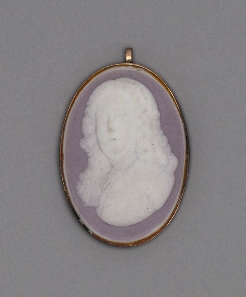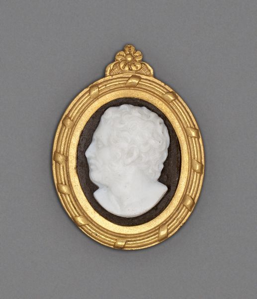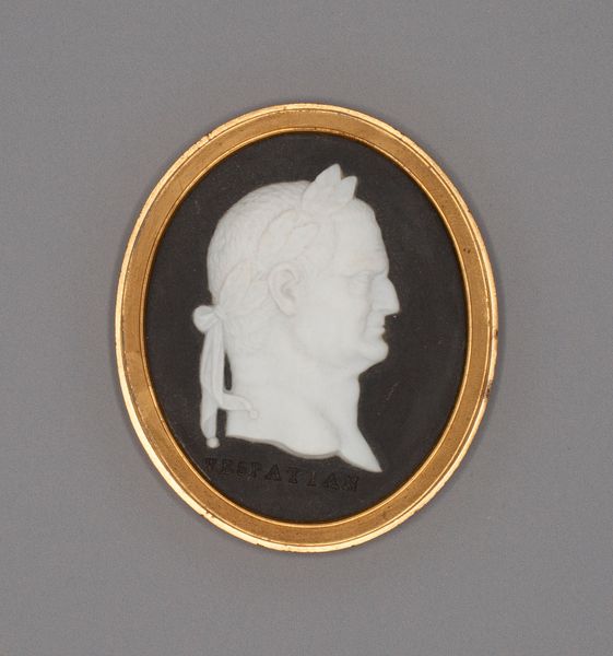 Curator: This miniature ceramic cameo, titled "Cameo with Head of a Woman," was crafted by the Wedgwood Manufactory around the late 18th century. The delicate relief work immediately strikes me with its poised grace, wouldn't you agree? Editor: Oh, absolutely. It has this quiet, almost haunting beauty. It feels like holding a whisper from the past—intimate and a little bit melancholy, if I'm honest. It's also visually striking—the whiteness against the gold frame pops. It has great detail. Curator: Indeed. Wedgwood pottery, during this Neoclassical period, sought to democratize fine art, and such miniature portraits, accessible to a wider audience, allowed for the circulation and affirmation of status and taste through a delicate decorative form. The gold frame adds to this sense of value. Editor: I was going to say, the frame sort of elevates the piece. What is it about the profile view in art from this time? You always see powerful women looking regal to the side like this. Curator: Exactly. The profile, deeply rooted in ancient Roman portraiture, invokes ideas of power, virtue, and nobility, creating an allegorical allusion and establishing an instant connection to revered historical precedents. These images had powerful symbolic meanings. This wasn’t accidental! Editor: Ah, so it's all about constructing the female image within these strict power structures of the time. I find myself wondering who this woman was and what was life for women during this time, or even what this work meant for female representation. Curator: Precisely. Though anonymous, she embodies the era’s ideal woman. This allows for an understanding of the period’s aesthetic and social codes and provides space to discuss contemporary dialogues on beauty and representation. How, indeed, does the gaze influence our perception? Editor: That’s fascinating. You know, looking at it again, the simplicity is really affecting. This small token encapsulates so much! Thanks to art we're able to capture a fleeting feeling from a certain era. Curator: It offers an intriguing portal into the past. The capacity for artifacts such as these to reflect our own contemporary values is why such cameos continue to be worthy of conversation.