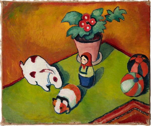 Curator: We are looking at "Radish," a woodblock print crafted in 1935 by Unichi Hiratsuka. Editor: What strikes me first is the unexpected boldness. It's a simple still life, but the vibrant, almost garish color choices – the orange background against that brick-red tabletop – really make it pop. Curator: Absolutely, and this boldness isn't just aesthetic. Hiratsuka, though deeply invested in the Ukiyo-e tradition, was a key figure in the Sosaku-hanga movement, which emphasized the artist's control over every stage of printmaking, moving away from the strict divisions of labor in earlier Japanese printmaking. Editor: So this emphasis on the individual craftsman elevates even the humble radish to a worthy subject. Are those leaves block-printed in two shades of green? It's amazing how he suggests depth using just a few distinct planes. Curator: Precisely, the commitment to the artist's vision meant that everyday subjects could become profound statements about the maker's interaction with the world around them. Think about the economic pressures and agrarian struggles of the 1930s. An image of nourishment like this takes on extra significance. Editor: I agree, and the roots themselves are so starkly white against the red surface, it nearly transcends realism. You've got this almost surreal, symbolic quality. It's fascinating how such a grounded, seemingly straightforward image opens into so many readings. Curator: Its enduring appeal surely resides in the combination of formal discipline and unexpected modernity. By positioning "Radish" in both artistic and socio-political circumstances, one realizes just how revolutionary this artwork truly is. Editor: Considering the context you brought up, this unassuming radish is so much more than just a radish now. It stands as a statement. Curator: Exactly! A testament to a philosophy as much as artistic mastery.