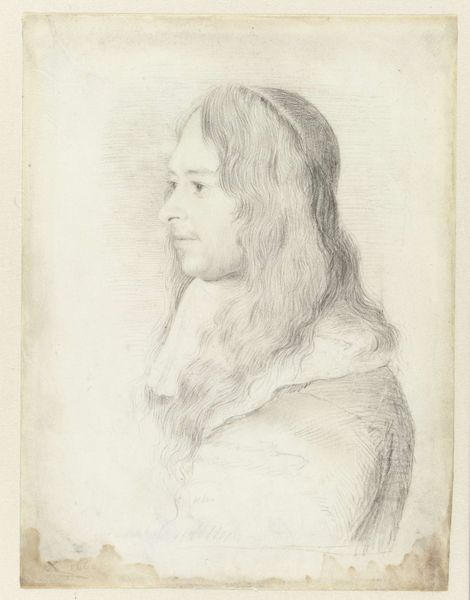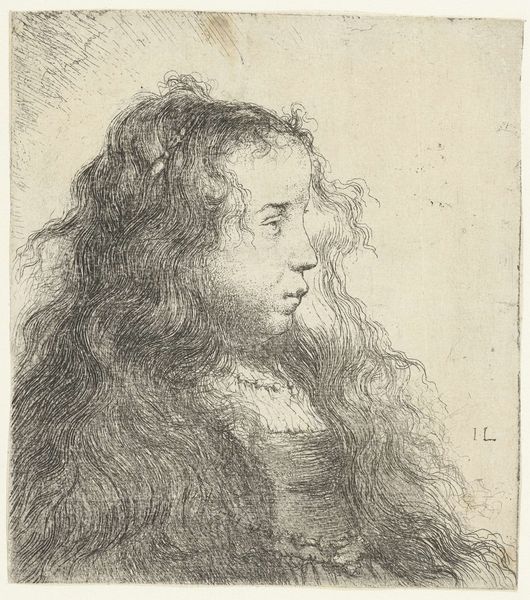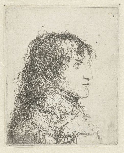 This is Jan Lievens's 'Borstbeeld van een jonge edelman', an etching on paper in the collection of the Rijksmuseum. The portrait presents a young nobleman in profile, his gaze directed towards an unseen point, rendered in delicate lines and subtle tonal gradations. The composition is dominated by the intricate details of the subject's hair, cascading in loose waves that frame his face and neck, which contrasts with the smoothness of his skin. Lievens's mastery of the etching technique is evident in the nuanced use of line to create depth and texture, capturing the softness of the hair. The semiotic system at play here involves the subtle class codes embedded in the subject’s attire and bearing. The portrait destabilizes fixed meanings by inviting viewers to decode the markers of status, power, and identity within the formal structure of the artwork. The focus on form and structure encourages us to question how these elements operate as signs within broader cultural and philosophical discourses.