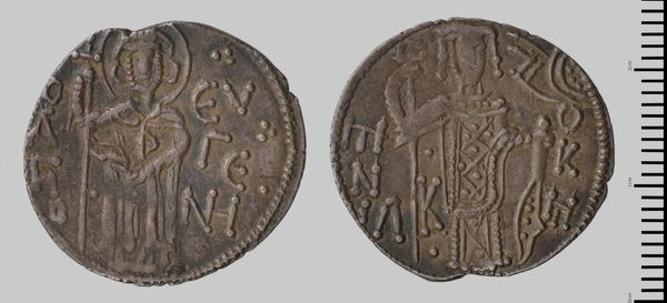 Curator: Well, look at this! It's an asper, a coin if you will, attributed to John II Komnenos of Trebizond. Editor: My first thought? Worn, but incredibly weighty, not just in grams, but history. You can feel it. Curator: It's more than just metal, of course. Consider the hands that held it, the markets it passed through... Editor: Exactly! The production of this small object, the labor involved, the very material it's made from - it connects us to a whole economic system, a society. Was silver readily available then? What was the process of minting like? Curator: And beyond the practical, think of the symbolic value. Each strike of the die, an assertion of power, a tiny advertisement of the emperor's authority... I wonder what stories this coin could tell. Editor: It really makes you think about value, doesn't it? What we deem precious, and why.