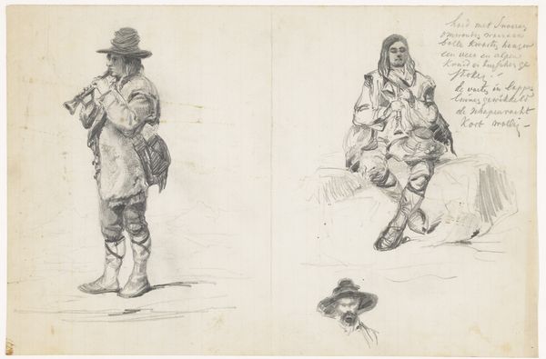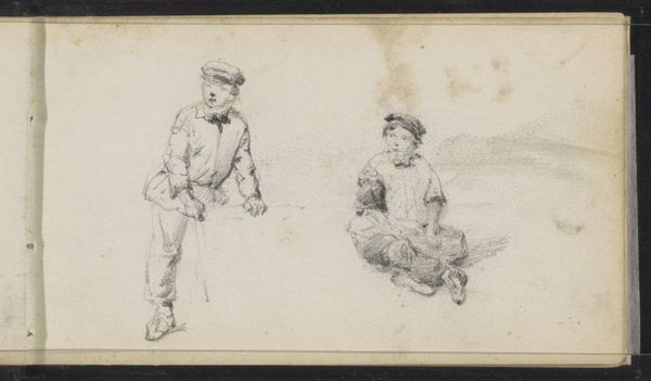 Editor: So, here we have "Standing and Sitting Hunter," a pencil drawing done in 1867 by Alexander Cranendoncq. It's housed here at the Rijksmuseum. There’s a certain stillness to it; the sketch-like quality makes it feel like a captured moment. What do you see in this piece? Curator: Captured indeed! I see a whisper of time, a glimpse into a life lived in close harmony with nature. It feels like more than just a study of hunters; it's a meditation on their existence. Do you notice how the standing figure is turned slightly away, almost hesitant, while the seated one, with his rifle, seems rooted to the earth? The contrast in their postures… it almost tells a story, doesn't it? Perhaps about readiness and weariness, the endless cycle of the hunt. Editor: Yes, I do. It also reminds me a little of an early photograph with a sharp focus and the sitters posed very still. Was this artist experimenting with photographic realism? Curator: Fascinating. Absolutely. There's an echo of realism in the precision of detail – the textures of the fabric, the weathered faces. This pursuit of realism was all the rage. The drawing feels both intimate and detached. He’s not sentimentalising, or celebrating, these guys. Instead, Cranendoncq presents them in their raw simplicity. Doesn’t that evoke a powerful quietness? Editor: Definitely. It's more thought-provoking than I initially realised, and the backstory definitely made the stillness sing out much louder to me. Curator: Exactly! It is funny, isn't it, how art speaks in such quiet, yet profound whispers, inviting us to lend an ear, and perhaps, even listen to our own echoing thoughts and emotions?