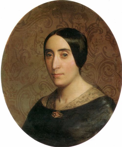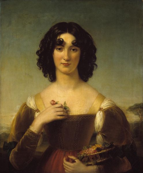 Curator: Looking at Elisabeth Jerichau Baumann's "A Roman Woman," dating from the 1840s and housed right here at the SMK, one immediately observes how the oil paint lends itself to capturing the delicate fabrics and nuanced complexion. What are your initial thoughts, Editor? Editor: The air is thick with unspoken stories! I see a woman, yes, but more than that, I feel a life lived with a quiet intensity, a hint of sun and shadows behind her gaze. It’s not just a portrait, it's a whisper of a world. Curator: Baumann, amidst the Romantic movement, very consciously created these intimate portraits of women, focusing on their representation, sometimes even using local models as signifiers of cultural exchange, wouldn't you agree? Notice the lace shawl; its likely Italian, the gold earrings are definitely markers of status. Editor: Absolutely! I see that tension between display and authenticity. She is holding a fan, yet it's almost like she's peering right through me. Did you also feel like the romantic framing gives it a stage-like presence that separates it from being an objective piece? Curator: Precisely! Baumann's portraits also acted as marketable depictions for the European gaze, showcasing women of other cultures. Oil paints would allow her to create very sensuous texture too. I do wonder about the artist's choices when creating for her target audience and what that says about consumption and cultural projection at the time. Editor: It's intriguing to consider those layers, isn't it? But in the end, my eye always returns to her eyes – that slight downturn that betrays something deeper. Even a controlled portrait like this can’t help but leak emotion! It almost reminds you that perfection in paintings don’t really mean anything! Curator: A testament to the skills needed to produce those textures! The details become integral components to her cultural identity within the market place! It makes you reflect how an artwork becomes entangled with identity, class and production. Thank you, this was incredibly enlightening! Editor: Always a pleasure. Until the next masterpiece then! I know that each time there is an artwork involved, there will always be a spark waiting.