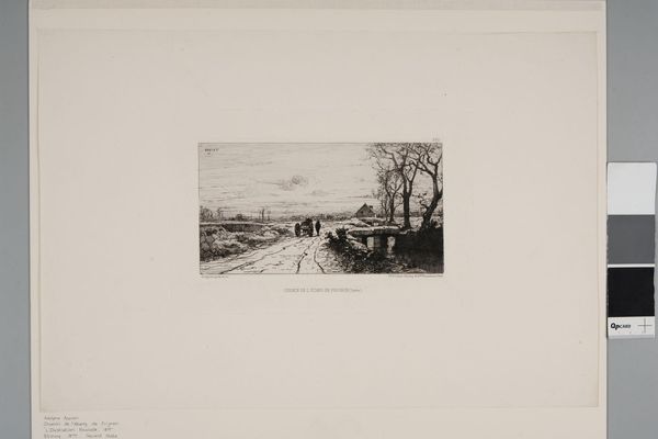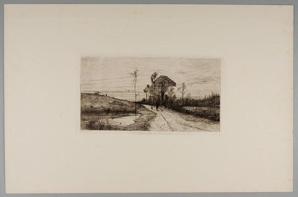 Editor: Adolphe Appian's "An Autumn Day at Artemare" renders a somber scene. The drypoint etching feels so intimate, capturing a solitary figure on what looks like a well-trod path. What historical narratives might this image be hinting at? Curator: Appian was working during a time when the French countryside was being both romanticized and industrialized. His choice to depict a seemingly simple scene actually engages with the evolving relationship between urban centers and rural life. Do you see how the composition guides our eye towards the distant town? Editor: Yes, the building in the background creates a sense of place! It also makes me wonder how this image would have been received at the time. Curator: It would have been seen as a reflection of the changing French landscape and perhaps a commentary on the loss of traditional rural life in the face of modernity. Editor: I never considered how much social context could be embedded in such a quiet image. Curator: Indeed. Art is rarely created in a vacuum; understanding its context allows us to truly appreciate its depth.