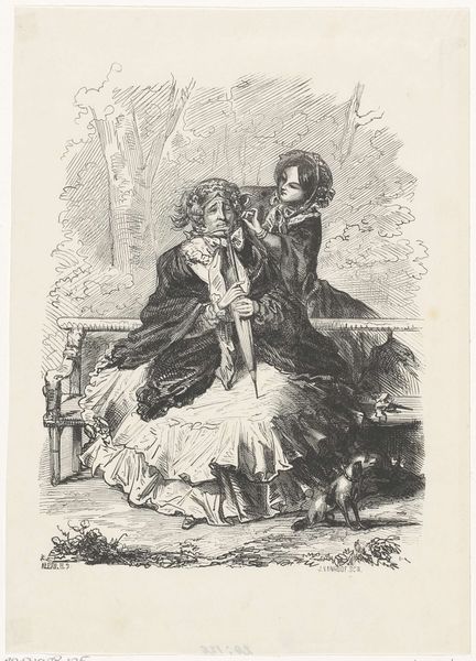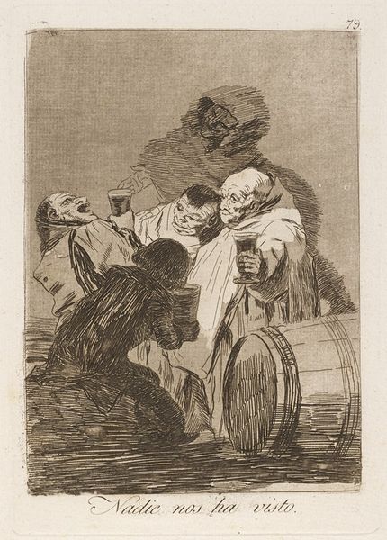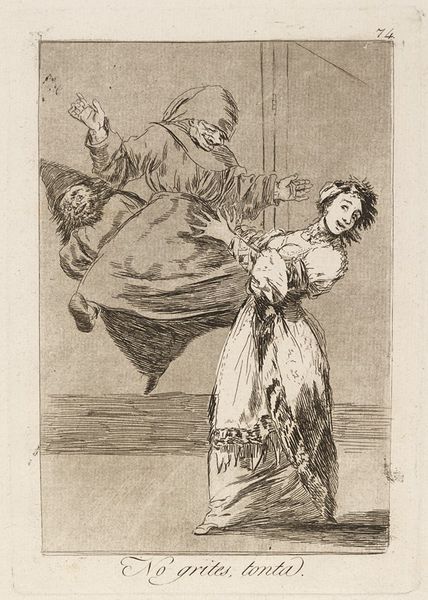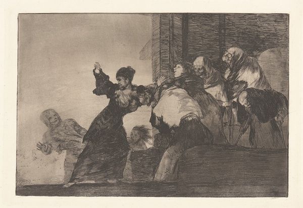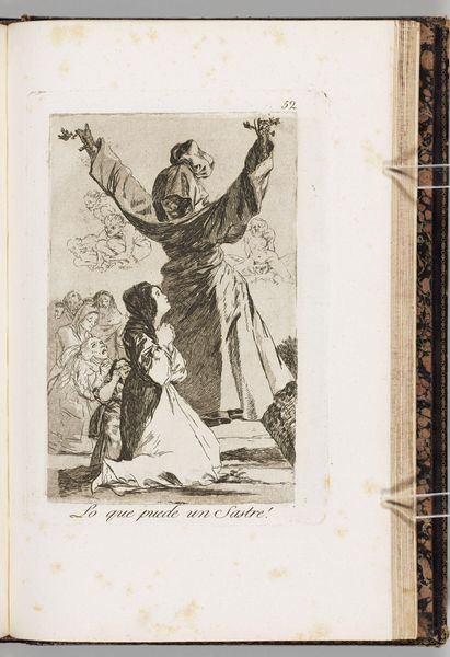 Curator: This etching, "Lo que puede un Sastre!" which roughly translates to "What a Tailor Can Do!" was created by Francisco de Goya around 1796-1797. It's quite a provocative piece, wouldn't you agree? Editor: Provocative is an understatement! My gut reaction? A touch unsettling, like a dream teetering on the edge of nightmare. That looming figure is...well, rather overwhelming. What are we actually looking at? Curator: Indeed! It’s part of Goya's "Los Caprichos," a series of prints that critique the absurdities of Spanish society. It uses allegory to address political corruption, social injustices, and the abuses of power. Specifically, the satire seems to target the aristocracy, their pretenses and those elevated without merit. Editor: So, the tailor...becomes a king or some powerful figure, fueled by ridiculous circumstances? It hits at the farcical nature of authority. Plus, it’s all done with such deftness; I love how expressive the faces are. Curator: Absolutely. The group of figures to the left is especially potent. Goya uses his skill with aquatint and etching to great effect. I am interested in looking into its critique of power structures and their construction during times of great socio-political turbulence. This specific etching reveals some things about gender and societal power as well, specifically for the kneeling woman. Editor: I also notice the sort of winged cherubs hanging in the sky above. Are they putti? If so, the contrast between their innocent imagery and the somber, serious subjects of this scene only further serves to amplify the underlying strangeness. Curator: Yes, the cherubs add an ironic layer, mocking the idea of divine approval for such a ridiculous figurehead. Editor: So much contained in such delicate lines. It's hard to believe Goya did this so long ago, the message resonates. Curator: Precisely. And looking at how this artwork and so many of Goya's pieces comment on themes and topics we still reckon with makes this art so important to explore in modern contexts. Editor: Agreed, these images offer something timeless, even in their specific criticisms. It has to do with revealing what a fraud authority can be! Food for thought for all!