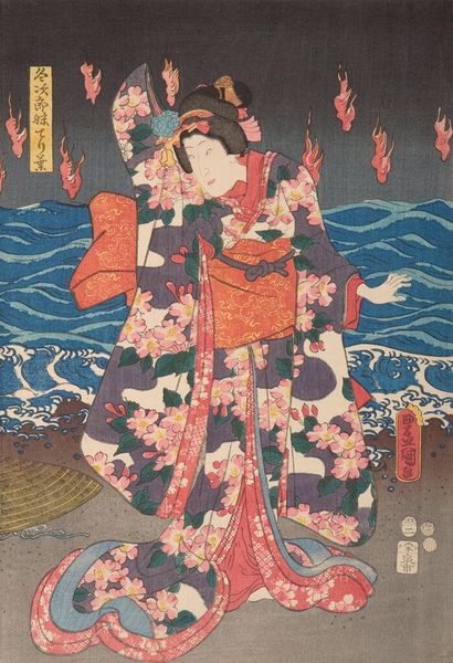 This print of a woman caught in a storm near the Sumida River was made by Utagawa Kunisada, likely in the first half of the 19th century. It’s a woodblock print, meaning that each color you see was carefully carved into a separate block, inked, and then printed onto paper. Look closely, and you can see how the material of the wood influences the final image. The smooth, flat planes of color, the crisp lines, and the overall graphic quality all speak to the inherent properties of the woodblock. The process of carving these blocks requires immense skill and patience, a tradition passed down through generations of artisans. Consider the labor involved in creating this print. From the artist who designed the image, to the carvers who meticulously translated the design onto wood, to the printers who painstakingly applied the ink and pressed the paper, each step required specialized knowledge and expertise. In appreciating this work, we must recognize the collaborative nature of its production. We gain a deeper understanding of the image by acknowledging not only the artist's vision, but the skilled hands that brought it to life.