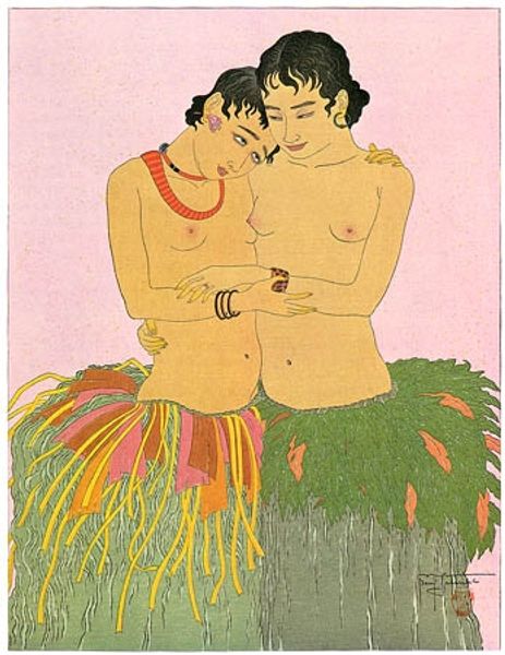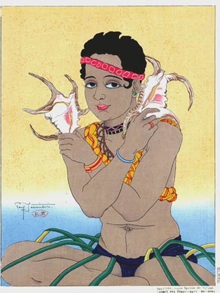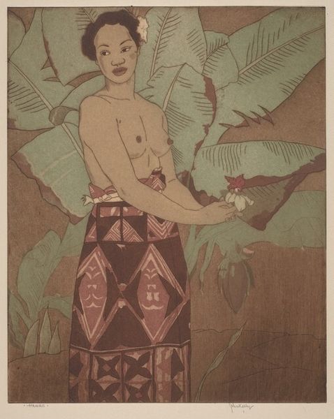 Editor: Here we have Paul Jacoulet’s "Belle De Yap Et Orchidees. Ouest Carolines," a 1934 woodblock print. There’s something both vibrant and… unsettling about it. What catches your eye? Curator: What interests me immediately is the materiality of this piece, and how it positions itself within a system of labor and cultural exchange. Jacoulet, a Frenchman creating Ukiyo-e style prints of Micronesian subjects… consider the process. The woodblock print itself, a labor-intensive technique traditionally involving multiple artisans, layered with the subject matter that exotifies Yapese culture, specifically women. Do you see how the means of production contribute to a larger narrative of colonialism and consumption? Editor: So, it’s not just about the image, but about who made it, how, and why? The clash of cultures through the artmaking? Curator: Exactly. The printmaking process becomes a vehicle for the circulation of a particular colonial gaze. He isn't simply representing Yap; he’s commodifying an image for a Western audience. Look at the costume: its constructed presentation implies cultural control and speaks volumes about the social context and the art market's role in perpetuating these visual narratives. Who benefits from these depictions, and at whose expense? Editor: It really forces you to think about the power dynamics embedded in the art object itself. So, the print isn’t just aesthetically pleasing; it's a product loaded with history and social implications. I’m looking at this work with totally new eyes. Curator: Precisely. Analyzing the means of production allows us to deconstruct the artist's intentions and uncover the complex power structures at play. It encourages a critical assessment of artistic representation. Editor: That’s incredibly insightful. I hadn't considered the production and the market's role. Thank you for highlighting the materiality and cultural context!